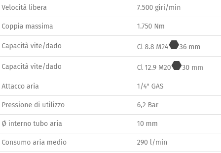 Caratteristiche: • Meccanismo impulsivo doppio martello • Leggero e bilanciato per un facile utilizzo • Comando d'inversione a leva • Tre differenti livelli di potenza in avvitamento • Scarico dell'aria attraverso l'impugnatura • Impugnatura antivibrazioni