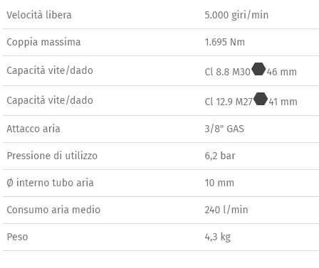 • Meccanismo impulsivo doppio martello • Robusto e compatto, dotato di un'elevata coppia • Comando d'inversione a leva • Tre differenti livelli di potenza in avvitamento e svitamento • Scarico dell'aria attraverso l'impugnatura • Impugnatura ergonomica antiscivolo