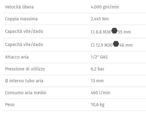 • Meccanismo impulsivo doppio martello • Albero da 8" • Dotato di maniglia ausiliaria • Comando d'inversione a leva • Tre differenti livelli di potenza in avvitamento • Scarico dell'aria posto nella parte superiore del corpo