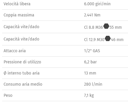 • Meccanismo impulsivo doppio martello • Albero da 210 mm (8,3") • Impugnatura con nuovo design, inclinata di 70° per non affaticare il polso • Dotato di maniglia ausiliaria laterale • 3 differenti livelli di potenza in avvitamento e svitamento • Scarico dell'aria posto nella parte inferiore del corpo • Ottimo rapporto peso/potenza