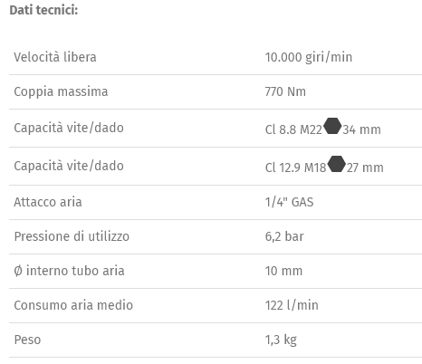 Caratteristiche: • Meccanismo impulsivo singolo martello • Incredibilmente compatto e potente • Comando d'inversione a pulsante azionabile con una sola mano • Tre differenti livelli di potenza in avvitamento • Scarico dell'aria attraverso l'impugnatura • Gancio per bilanciatore