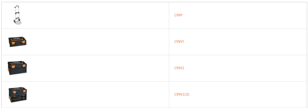 Composto da: • Carrello ultracompatto richiudibile con manico telescopico C99P (485x520x1095 mm) • Valigetta portautensili in ABS C99V1 (445x358x152 mm) • Valigetta portautensili in ABS C99V2 (445x358x254 mm) • Valigetta portautensili in ABS con 2 cassette portaminuteria trasportabili C99V3/2C (445x358x322 mm)