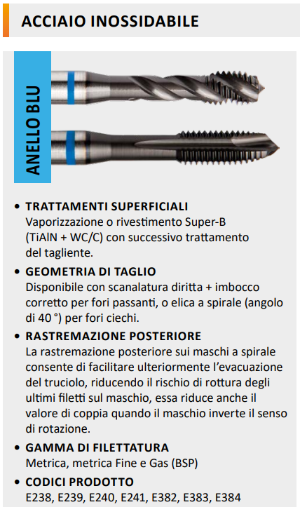 Anello Blu Maschio a macchina metrico con elica a 40 ° , standard DIN Maschio per fori ciechi con gambo rinforzato o ridotto per acciaio inossidabile di media resistenza. L’esclusivo substrato HSS-E-PM, insieme al trattamento dei taglienti, fornisce resistenza e sicurezza alla lavorazione. La vaporizzazione sulla superficie agisce per trattenere il fluido da taglio e prevenire l’incollamento dei trucioli.