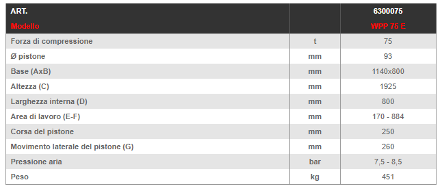 · Utilizzo versatile in vari settori · L‘efficiente progettazione di questa serie permette un ottimo rapporto qualità-prezzo · La molla di ritorno integrata e di serie permette un maggiore spazio di lavoro · Metodo di lavoro sicuro: il pistone può essere fermato in qualsiasi posizione · Robusto telaio saldato e forato per regolare l‘altezza della tavola inferiore in 9 posizioni · Pompa idraulica a 2 stadi · Cilindro laterale scorrevole · Completa di manometro per controllo pressione · Avanzamento del pistone possibile sia con pompa idraulica manuale che pneumatica a pedale