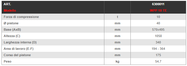 · Utilizzo versatile in vari settori · L‘efficiente progettazione di questa serie permette un ottimo rapporto qualità-prezzo · La molla di ritorno integrata e di serie permette un maggiore spazio di lavoro · Metodo di lavoro sicuro: il pistone può essere fermato in qualsiasi posizione · Tavola inferiore della pressa regolabile in altezza in tre posizioni · Completa di manometro per controllo pressione · Pompa idraulica incorporata, attivazione manuale · Costruiti secondo direttive CE