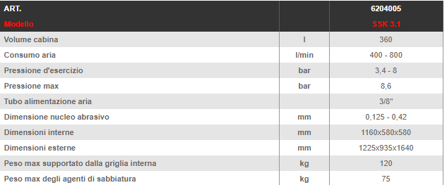 · Piano di appoggio robusto per il posizionamento dei pezzi all’interno della cabina