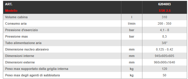 · Piano di appoggio robusto per il posizionamento dei pezzi all’interno della cabina