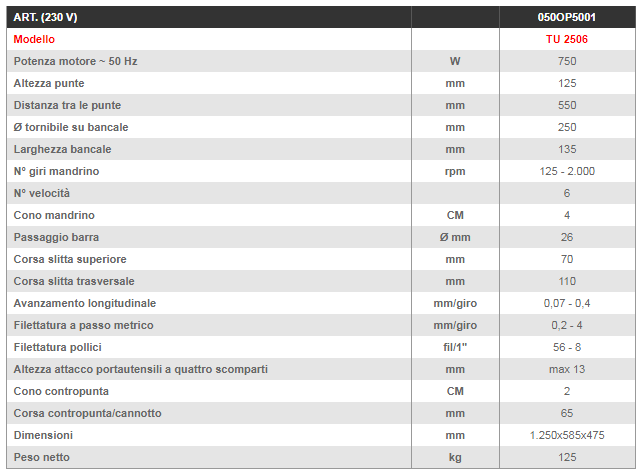 TORNIO PARALLELO TU 2506 V con variatore di velocità OPTIONAL